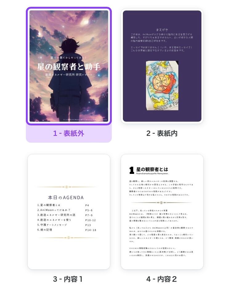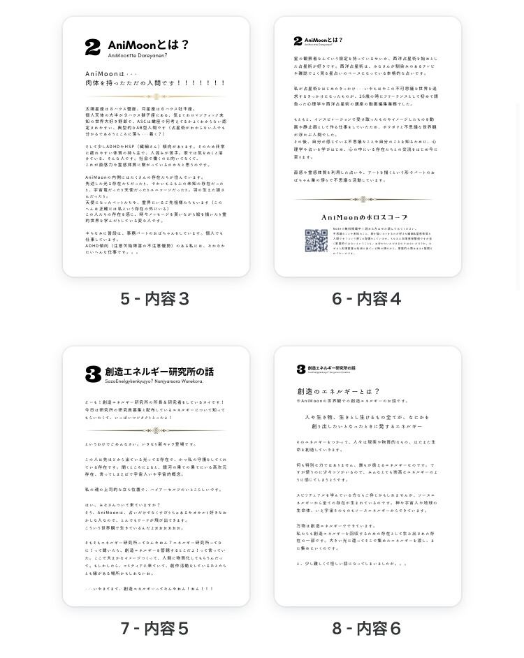 AniMoonの世界観設定本(こんな世界観で生きていますの話)創造エネルギー研究所のお話や、創造エネルギーの使い方、魂の記憶の話など盛りだくさんです。